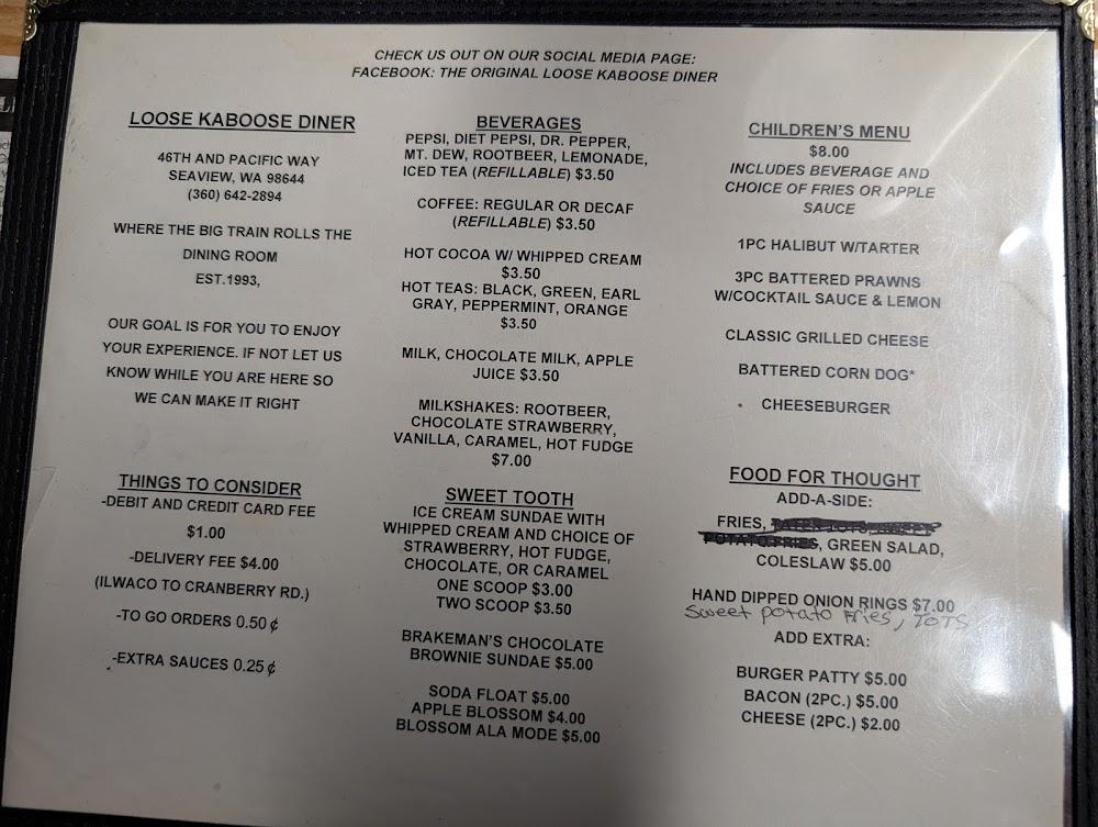 Loose Kaboose Diner offers a diverse menu, focusing on seafood and classic diner staples. Popular items include halibut, crab cakes, and the cod fish chips. For burgers, options like the Bleu Cheese Bacon and the Mushroom Swiss cater to varied palates. A children’s menu ensures even the youngest diners find something they love. Whether it's breakfast, brunch, or dinner, the menu includes favorites for everyone, making it a must-visit destination for food lovers.